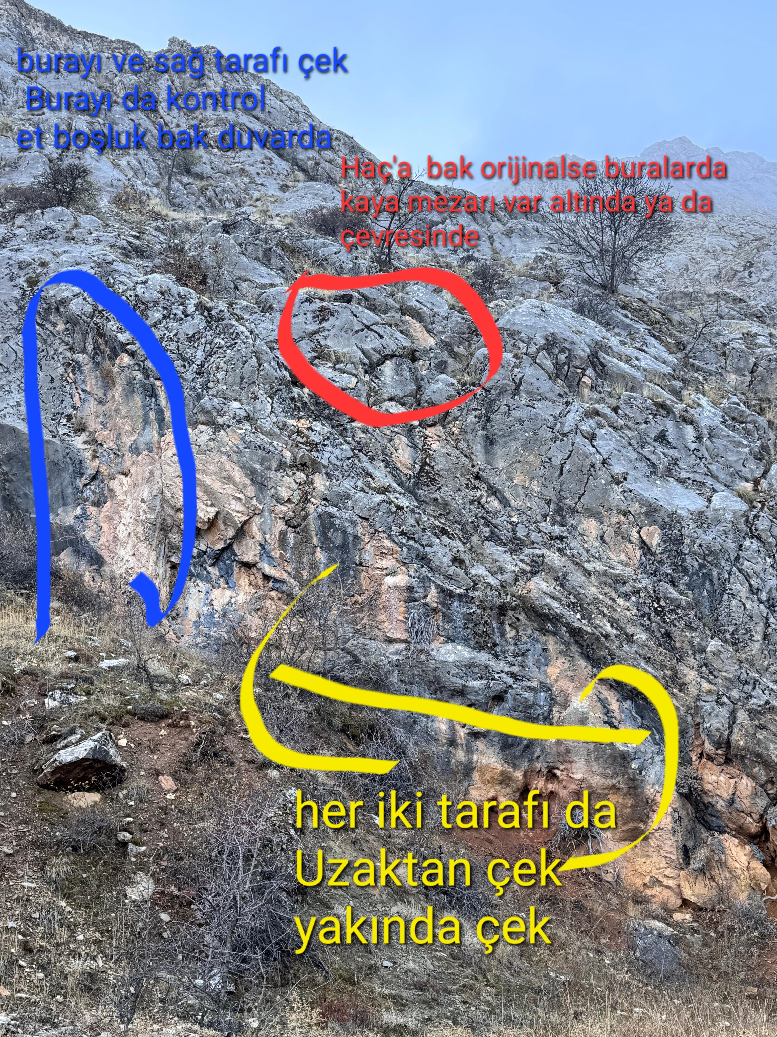 Ustam kaya yapısı genelde böyle buranın bir çok oyma var gibi ama çoğunlukla doğal gibi, ve işaretlediğin yerlere tırmanmak gerçekten imkansız gibiBu resime biraz zaman ayirdim. Sari renkli yerlerde kare ve yuvarlak oyma var mi? diye kontrol et,emin olduktan sonra; mavi yerlerde sert lastik cekicle bosluk kontrolu yap.
