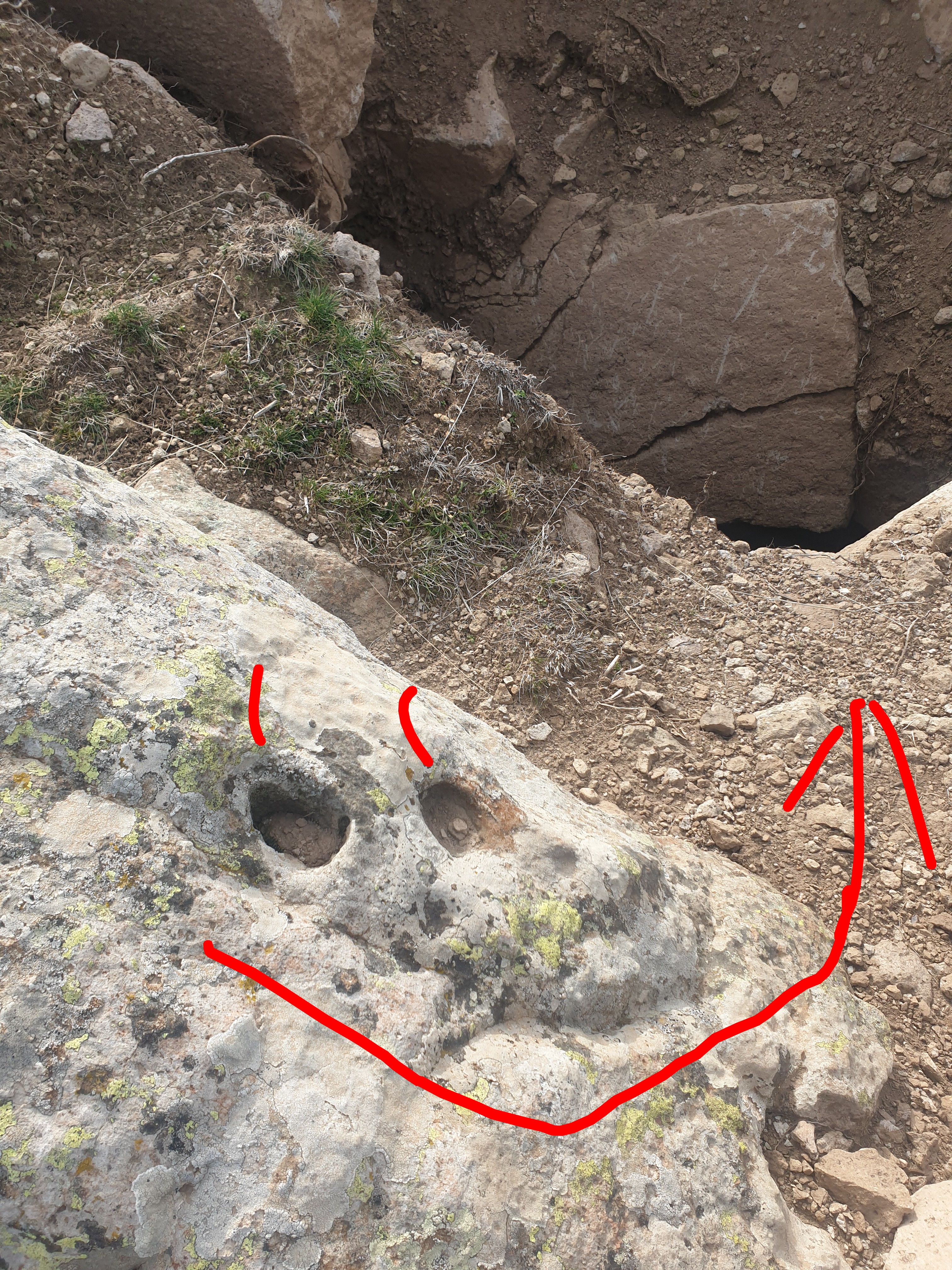 Geçen sene köyden birilerinin bu hançerini hemen alt kısmından gerdanlık aldığını söylemişlerdi bende eğer müjdesini aldılarsa mezarının da uzakta olmayacağını söyledim ama aradık bulamadık dediler bende bölgeye gittim işaretin de yardımıyla kayaların arasında bir yeri gözüme kestirdim çektim çubukları direkt olarak yapı boşluk verdi 3 tane farklı görüntüleme cihazı ile çekim yaptık lakin ekranda hiçbirşey vermiyordu aklımızda kalacağına emeğimiz kalsın diyerek bismillah çektik şekildeki gibi bir yapı boşluk yakaladık girişin hemen ilerisi fotoğraflardan da anlaşıldığı üzere taş örme yapı lakin definecilerin korktuğu o horasan keşke o yapılarda da kullanılsaydı