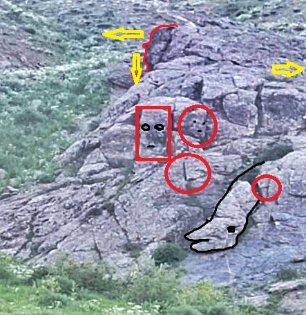 Resimde oklar ile işaretlediği m yere ve yönlere de bak orada bir yüz figürü de görülüyor. bbu kayanın dört bir yanını incele