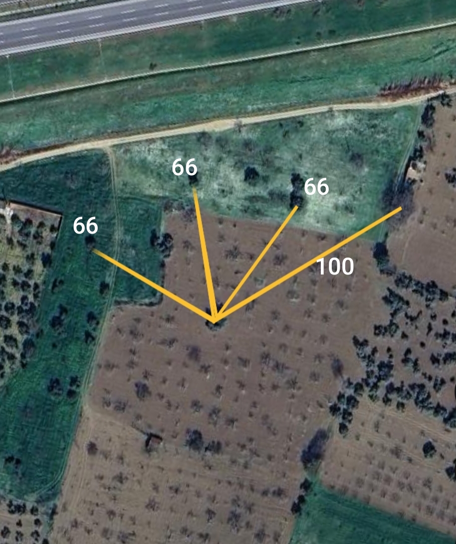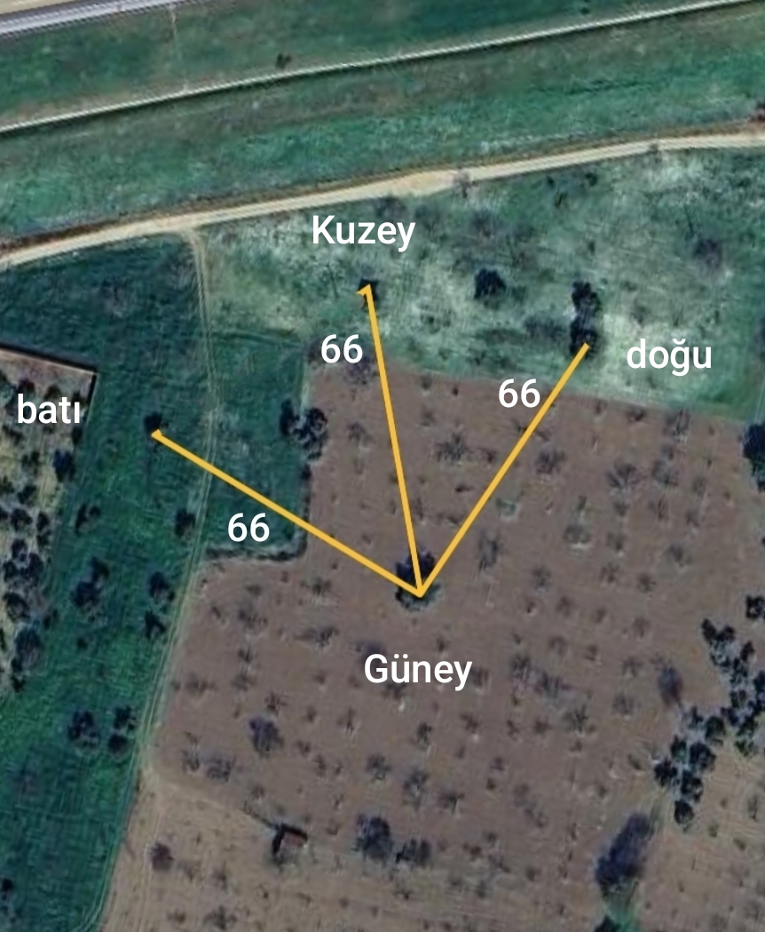 Selam ustalar geçenlerde bu konu hakkında paylaşım yapmıştım ama dikkatli bakınca başka şeyler keşfettim, ilk fotoğraf 4 tane zeytin ağacı var ara mesafeleri uydudan tam 66 metre, ikinci fotoğraf ta çizgilerin konumunu değiştirince haç şekli ortaya çıkıyor, Batı tarafındaki ağaç tek kökten üç Ana gövde yükseliyor, üçüncü fotoğraf ise 100 metre doğuda meşe ağacı var, kafamı iyice karıştırdi burası