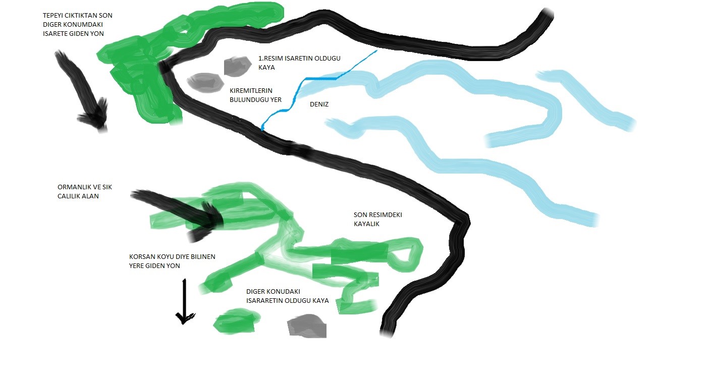 Evet yamac var ve biz oraya ciktik, ama sivri kayalik yok bunun yerine kayalar var, ve yaklasik 400 mt'de diger konumdaki isareti bulduk. Cevrede magara yok, varsa bile giris kapali oldugunda gorememisizdir. Diger isaretin oldugu yer ormanlik ve calilik alan zaten zar zor bulduk bu kayayi ucra bir yerde.