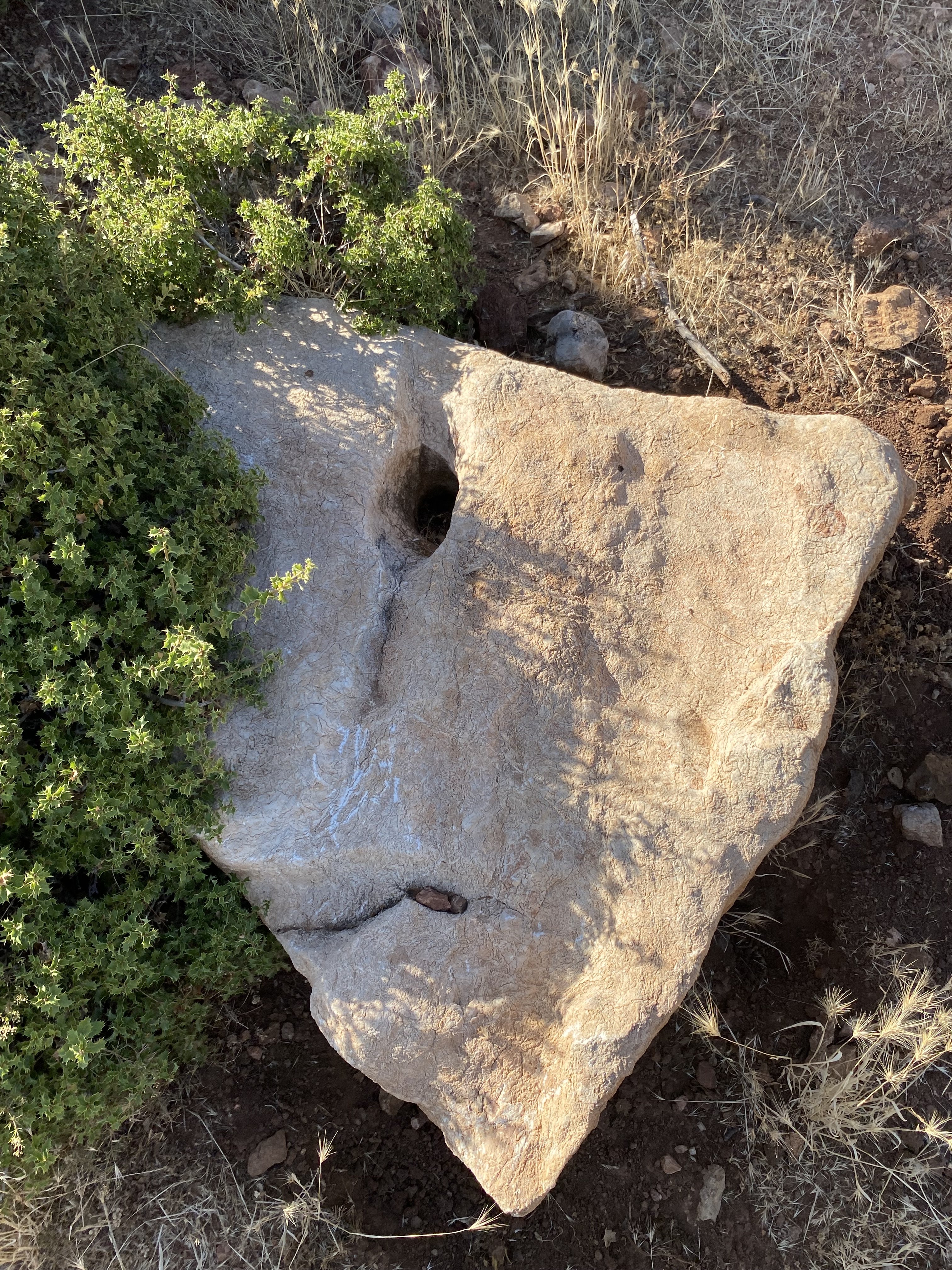 Büyük ihtimalle zemin altı kaya oyma mezar oda tipi ve giriş fotoya göre kayanın ya sağ tarafından veya üst taraf zeminden ama kayanın üzerine çıkıp dört bir yanın fotolarını çek ve 20 mt uzaktan kayanın dört bir yanından fotolarını çek ve hemen kayanın yanından tüm cepheyi ve zemini de görecek şekil de dört bir yanından fotolarını çek. Büyük ihtimalle aile mezarı ama dönem soygunu yemiş olma ihtimali %100.