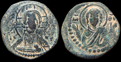 dört satır IhSUS \ XRISTUS \ bASILEU \ Basile. Şaşırtıcı, keskin detaylı ve koyu patine ile büyük para. ref: SB 1813 Huge 34 mm, 18.47 gr.. ex-Frank S Robinson, Albany, NY. # CB2039: 225 $[/SIZE] | [HR][/HR] [SIZE=-1]Romanus IV Reign, 1068-1071 AD. Nadir G Sınıfı bronz Follis.Bakan nimbus, pallium & colobrium giyen, Tomar tutan ve kutsama sağ el yükselterek İsa'nın büstü, IC-XC yanlarına, / silah upraised ile Meryem büstü karşısında pelet hudutları içindeOrans, nimbus, pallium ve maphorium giyen, pelet sınırları içinde. ref:. SB 1866 27 mm, 9.93 g. # CB2037: 99 $[/SIZE] | [HR][/HR] [SIZE=-1]