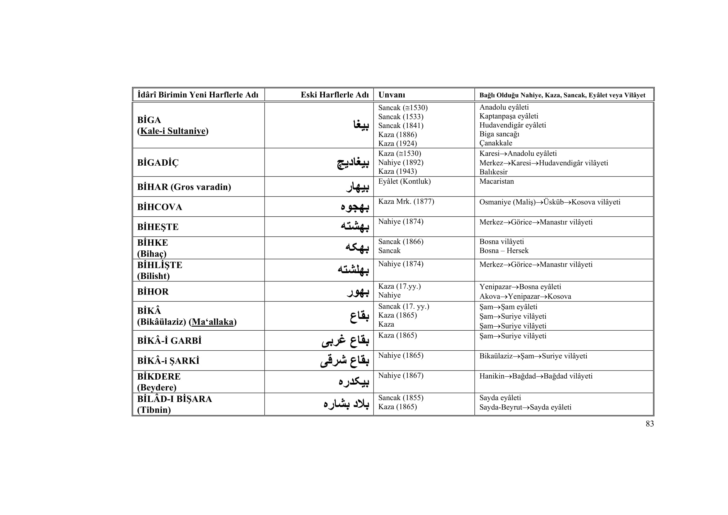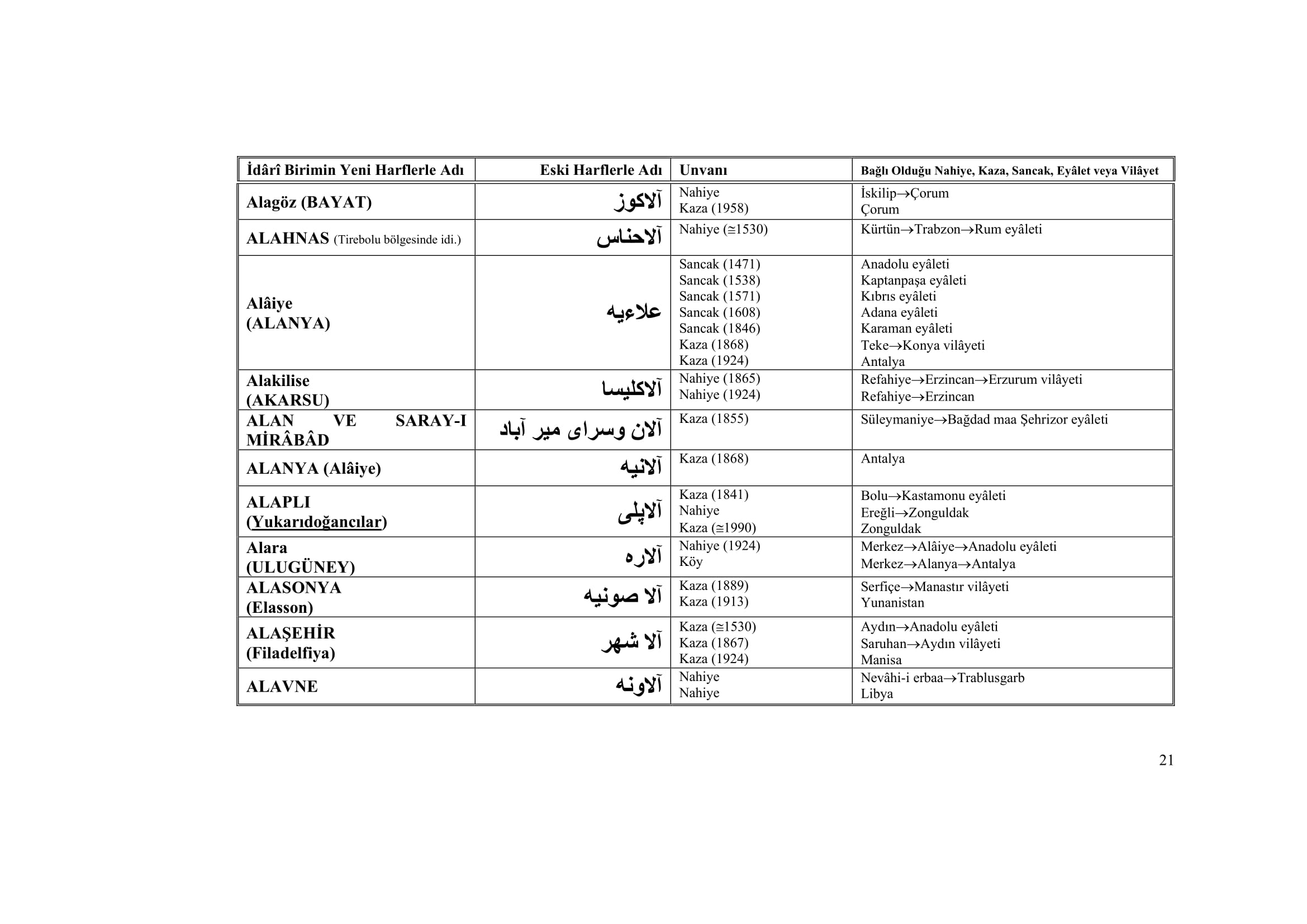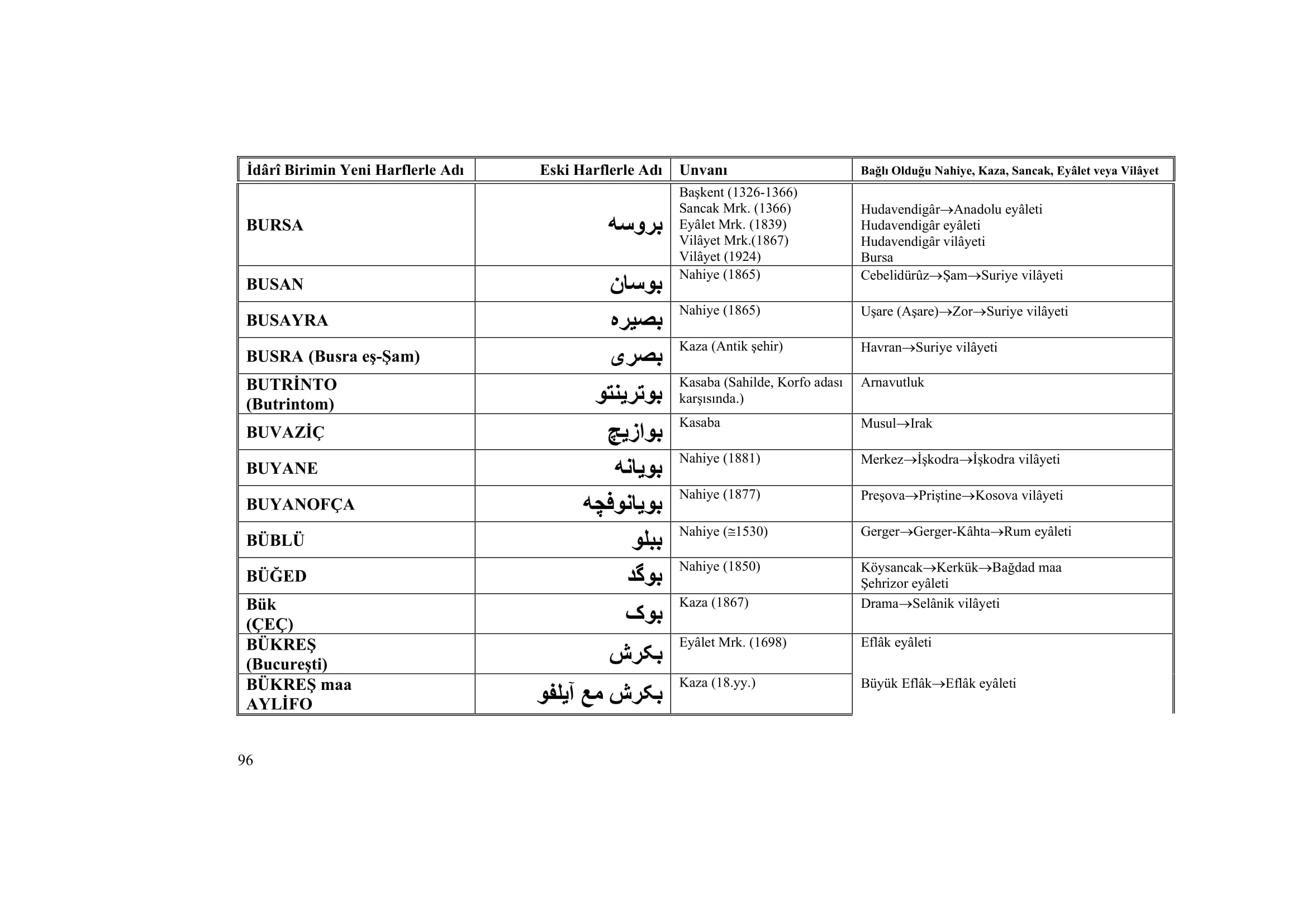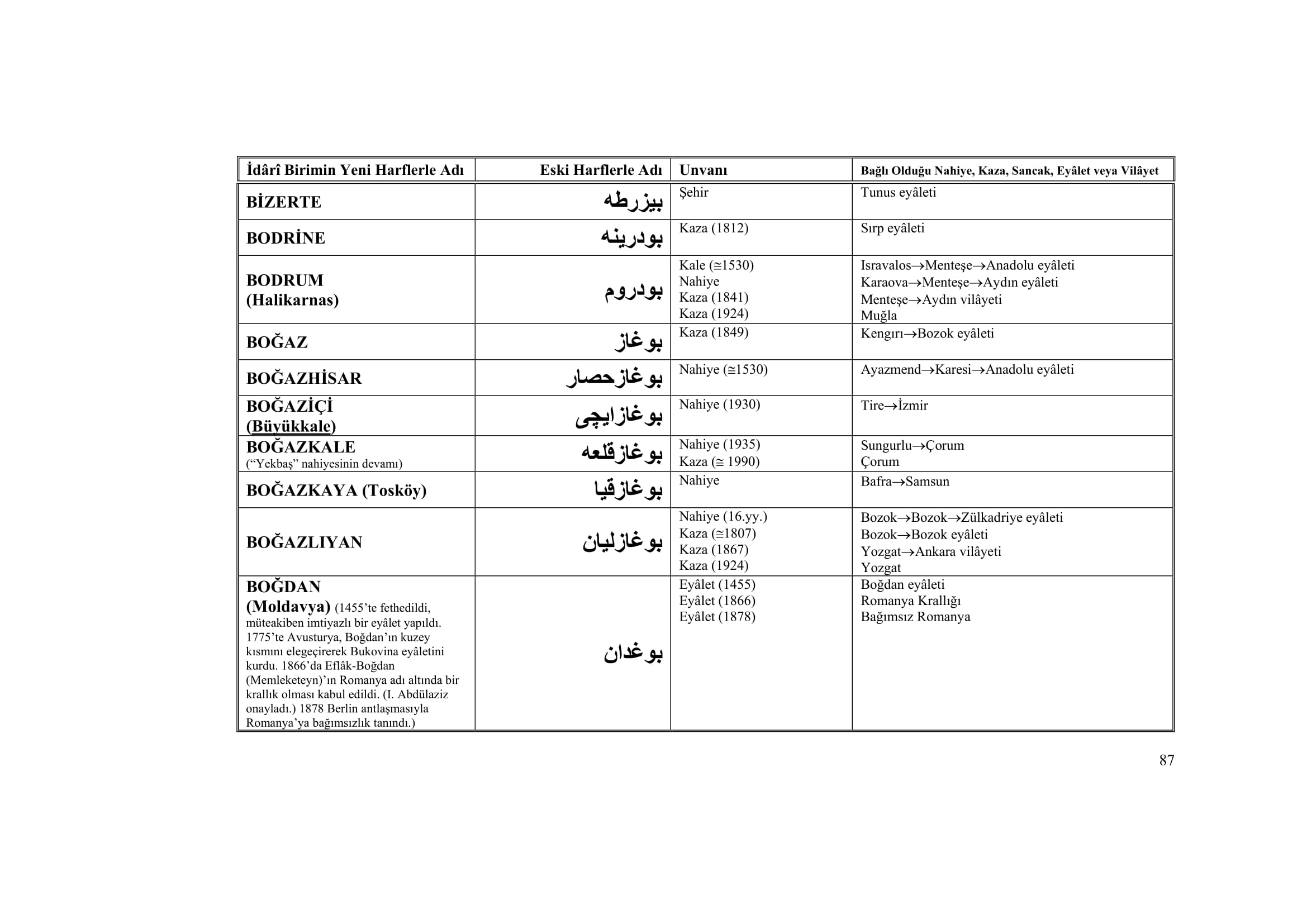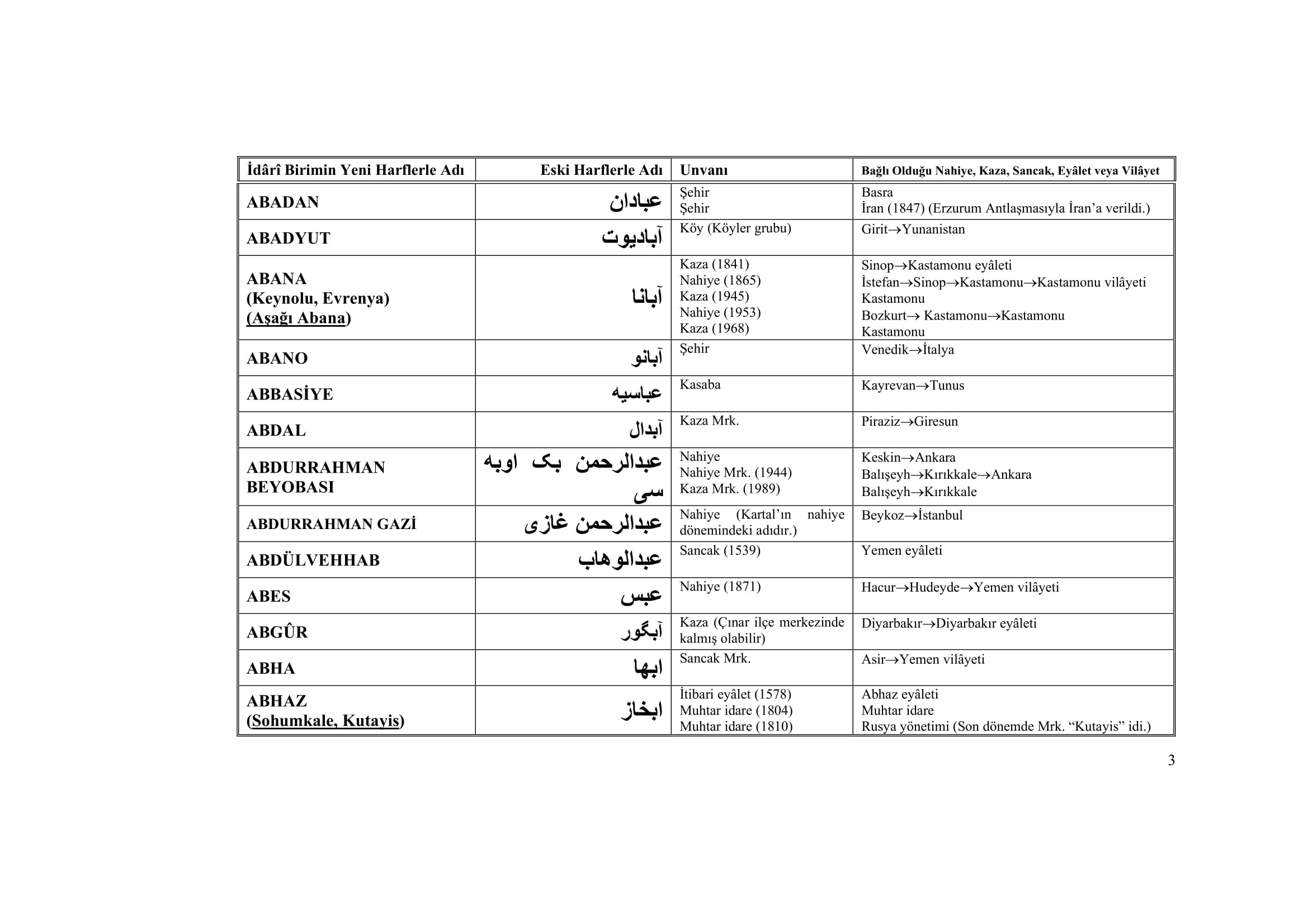 Şu an ismi bir çok kez değişen illerimiz, ilçelerimiz ve o dönemde Osmanlı hakimiyeti altında olan tüm topraklarda bulunan eyalet,vilayet, sancak, kaza ve nahiyeleri eski isimleriyle alfabetik sırada gösteren harika bir kaynakça. Eski ismi ile bildiğiniz ya da o dönem eski ismi ile anılan bir yeri bulmak adına kullanmak için güzel bir arşivdir.